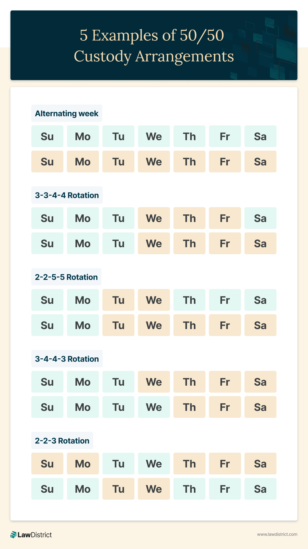 This rotation continues throughout the month, providing equal time with both parents and allowing for consistency in the children’s routines.