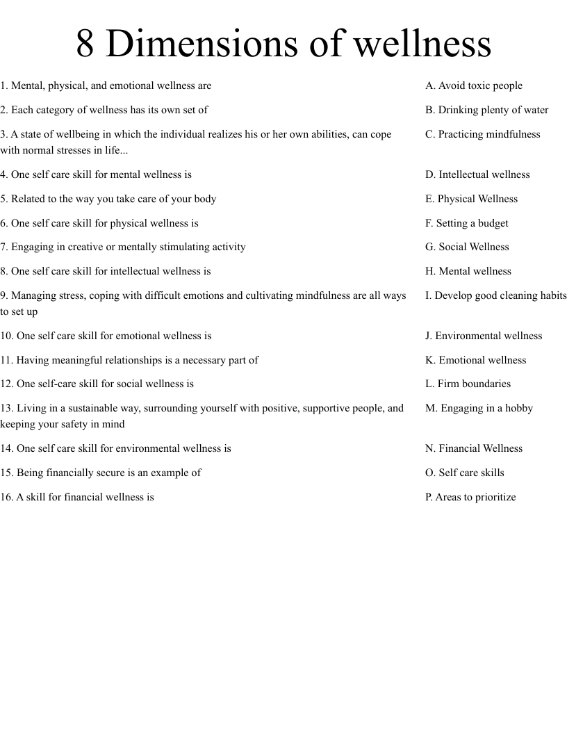 Wellness is a holistic approach to health that encompasses various aspects of our lives. The 8 dimensions of wellness worksheet is a tool that helps individuals assess and improve their overall well-being. By focusing on these dimensions, individuals can create a balanced and fulfilling life.