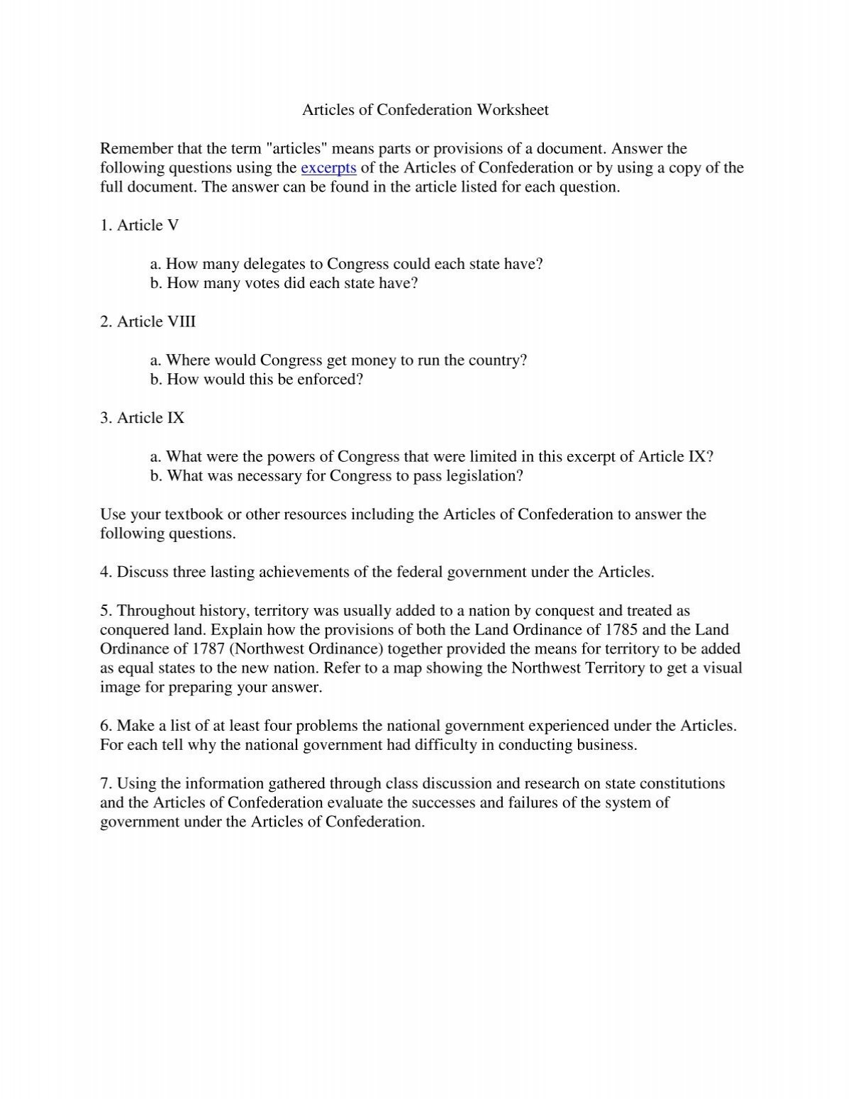 The Articles of Confederation worksheet typically includes questions and activities that prompt students to closely examine the text of the document. Students may be asked to identify specific articles, explain the roles of the central government and the states, and consider the implications of the weaknesses of the Articles.