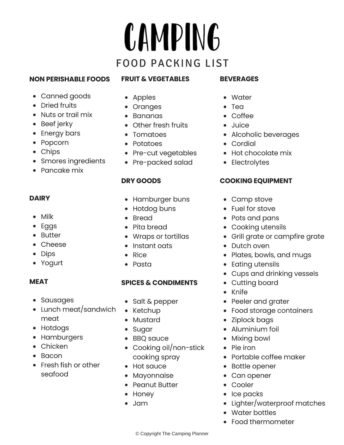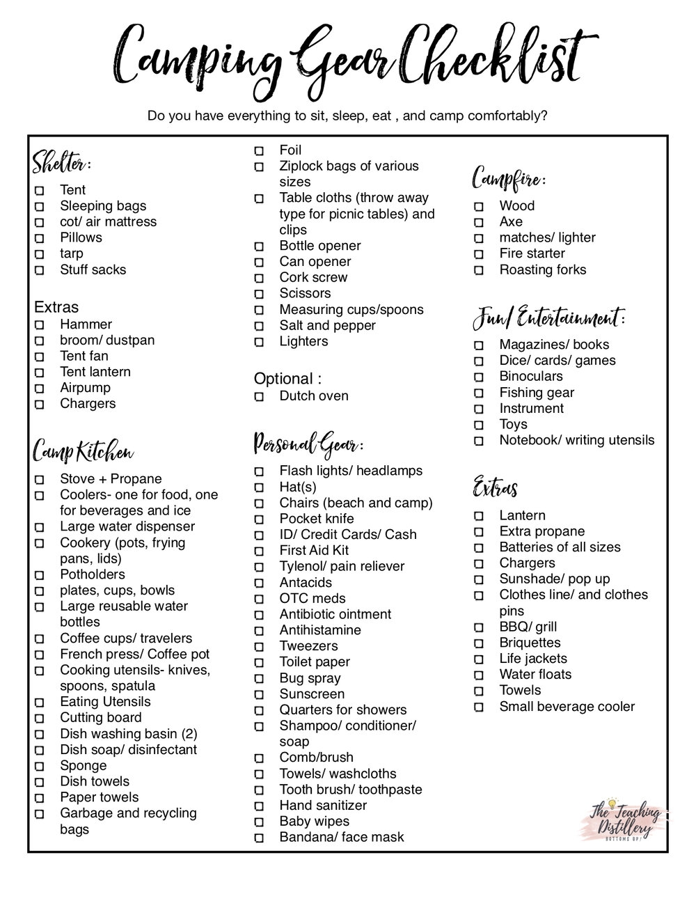 Here is a sample camping packing checklist printable to help you prepare for your next camping trip: