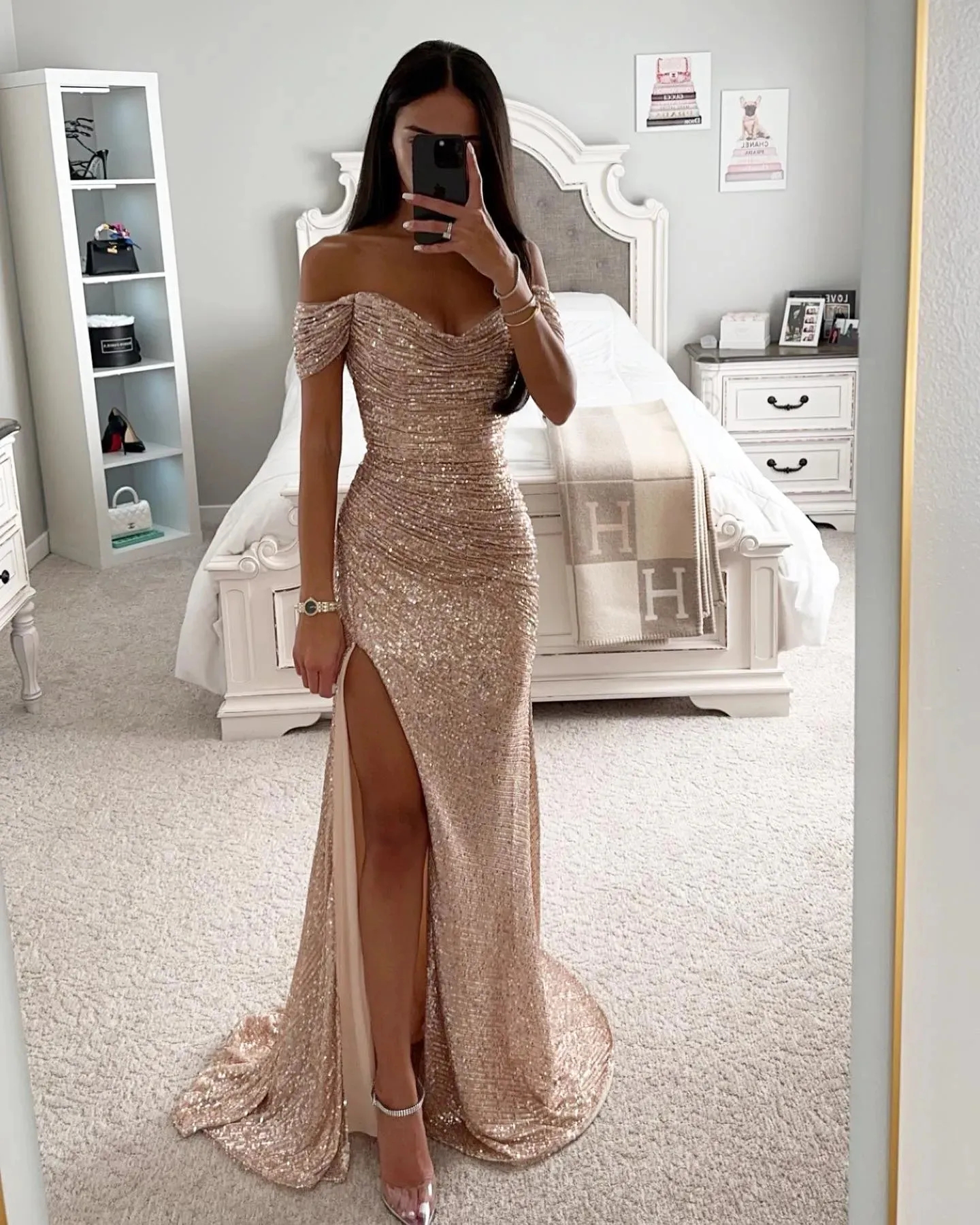 When it comes to shoes, champagne color formal dresses look stunning with metallic or nude heels. These colors complement champagne beautifully and create a cohesive and polished look. Add a clutch in a complementary color and you are ready to hit the town in style.