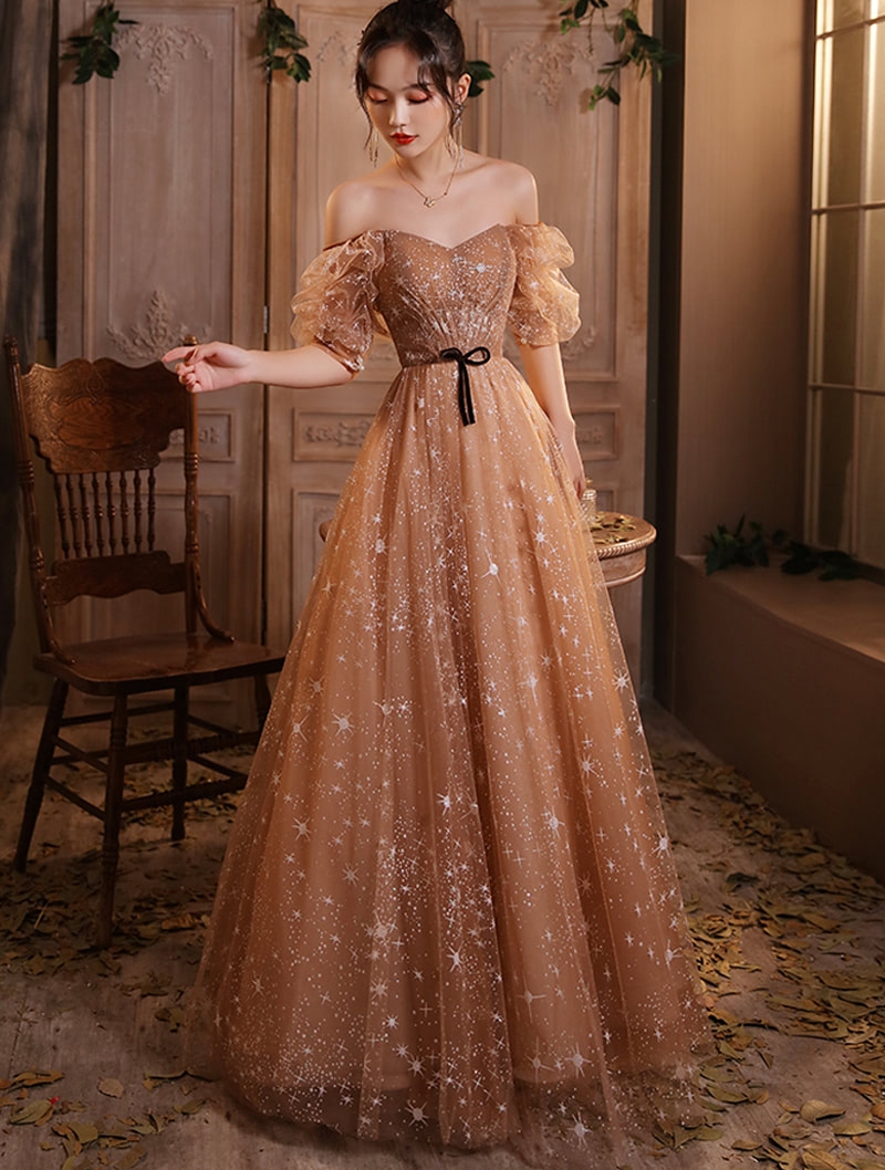 Sweet Champagne Short Sleeve Formal Evening Party Dress With Stars