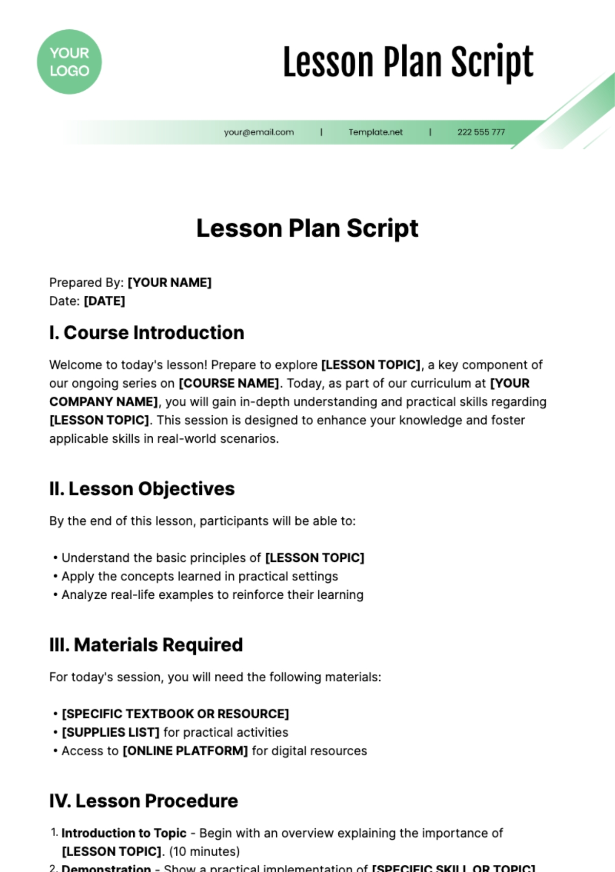 Here is a basic outline for a demo lesson plan template: