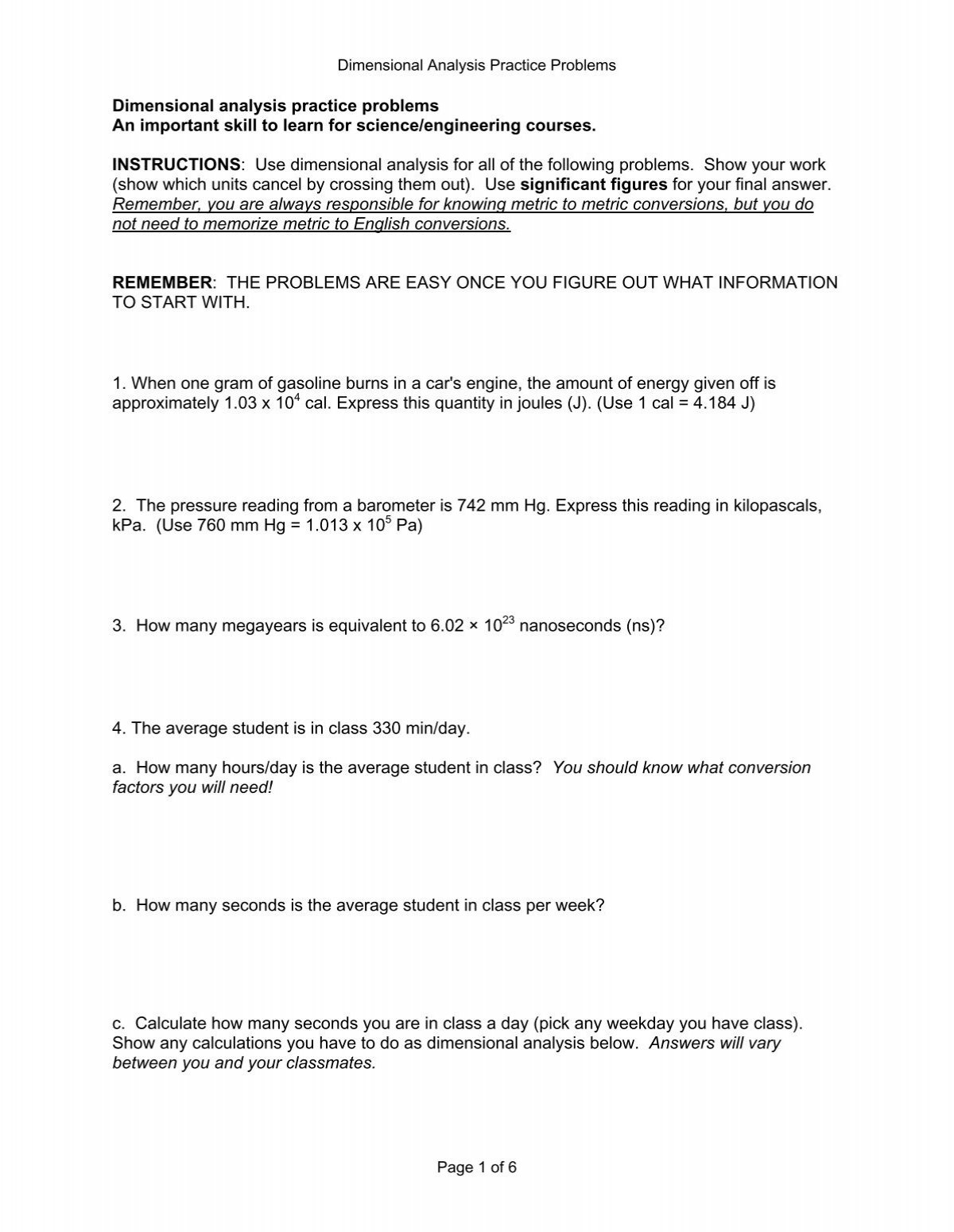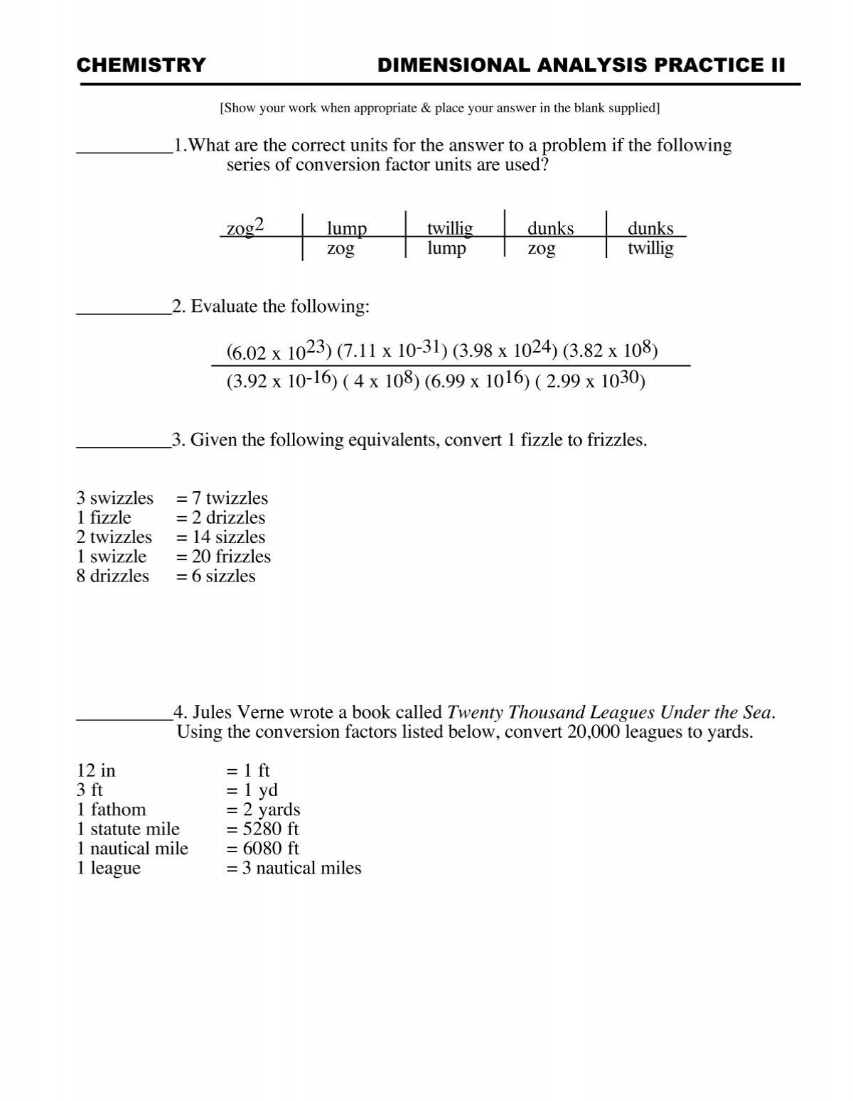 Dimensional analysis is a crucial skill in the field of science and mathematics. It involves converting units from one system to another by using conversion factors and maintaining the correct dimensions throughout the calculations. To master this technique, practice is essential. One effective way to practice dimensional analysis is through worksheets that provide various problems for students to solve.