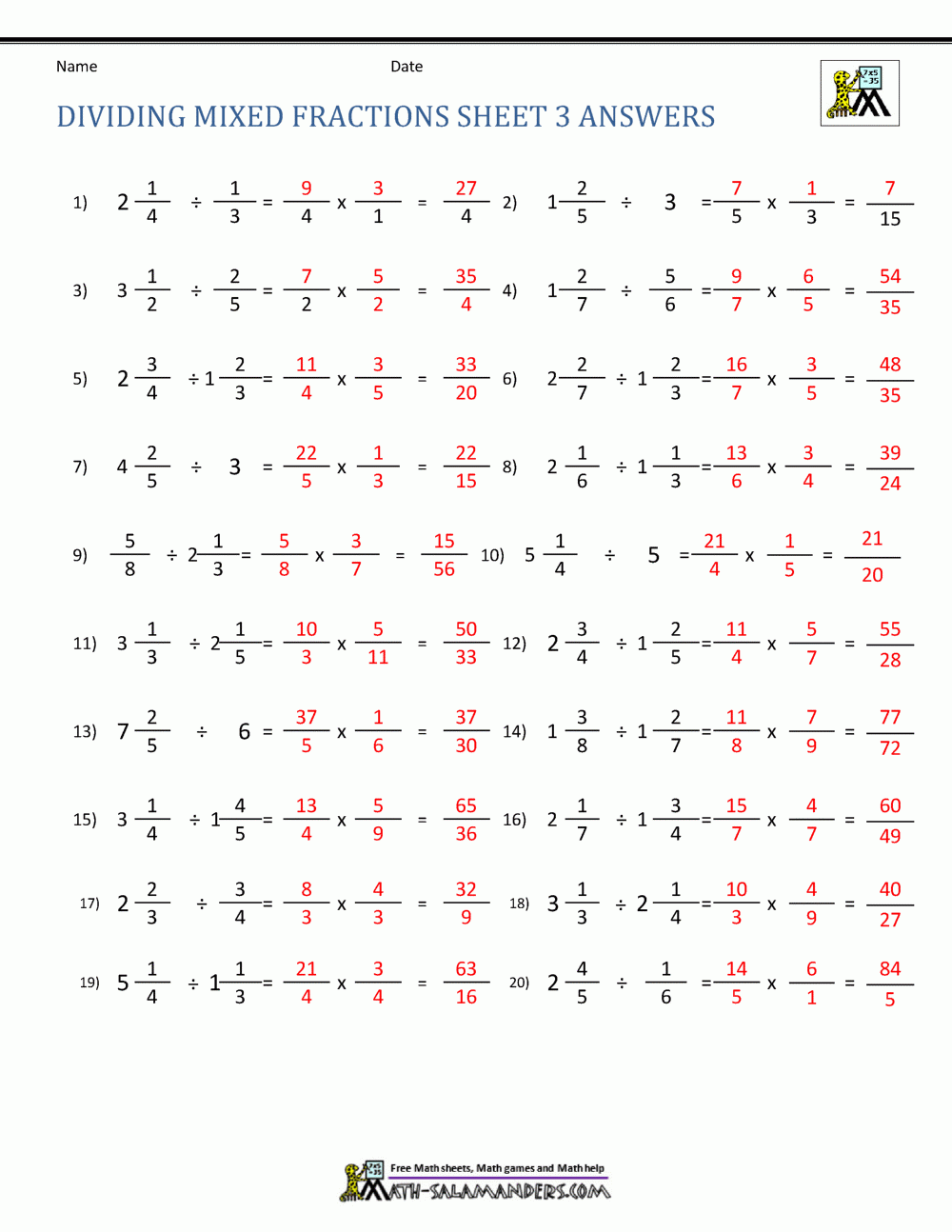 Dividing Mixed Fractions Worksheet