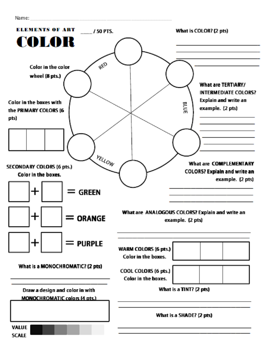 The elements of art color worksheet typically includes sections that cover topics such as the color wheel, color harmony, and color temperature. These sections provide a foundation for understanding how colors work together and how they can be used to convey different moods and emotions in a piece of artwork.