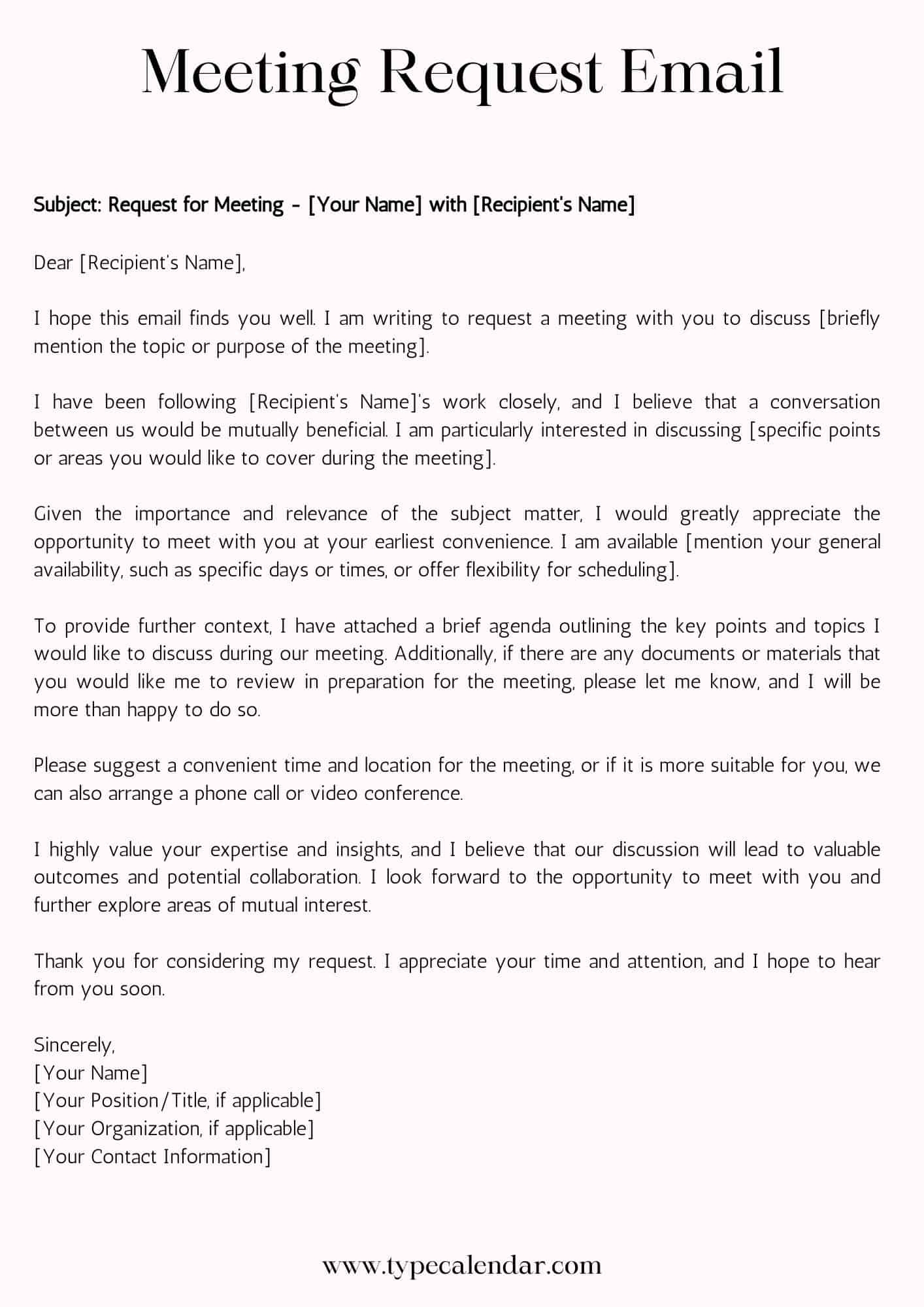 When sending out the email, be sure to customize the template with the recipient’s name and the specific topic or purpose of the meeting. This personal touch can help demonstrate your professionalism and attention to detail. Additionally, following up with a calendar invitation or reminder can help solidify the meeting and ensure everyone is on the same page.