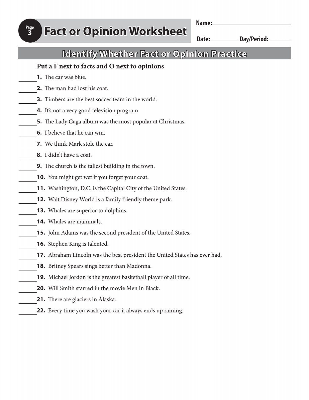 Fact Or Opinion Worksheet