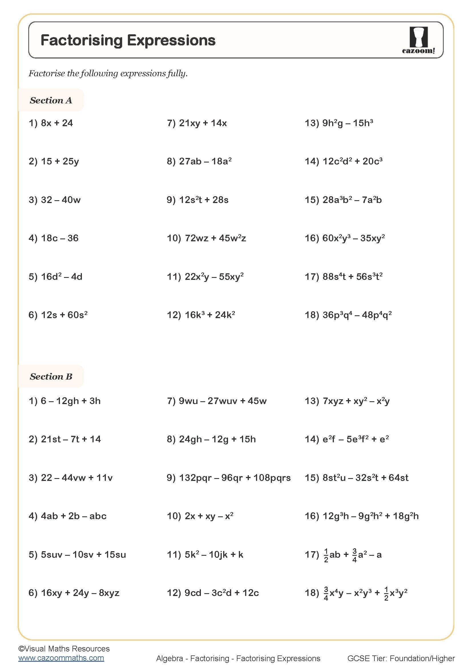 Factorising Expressions Worksheet Cazoom Maths Worksheets