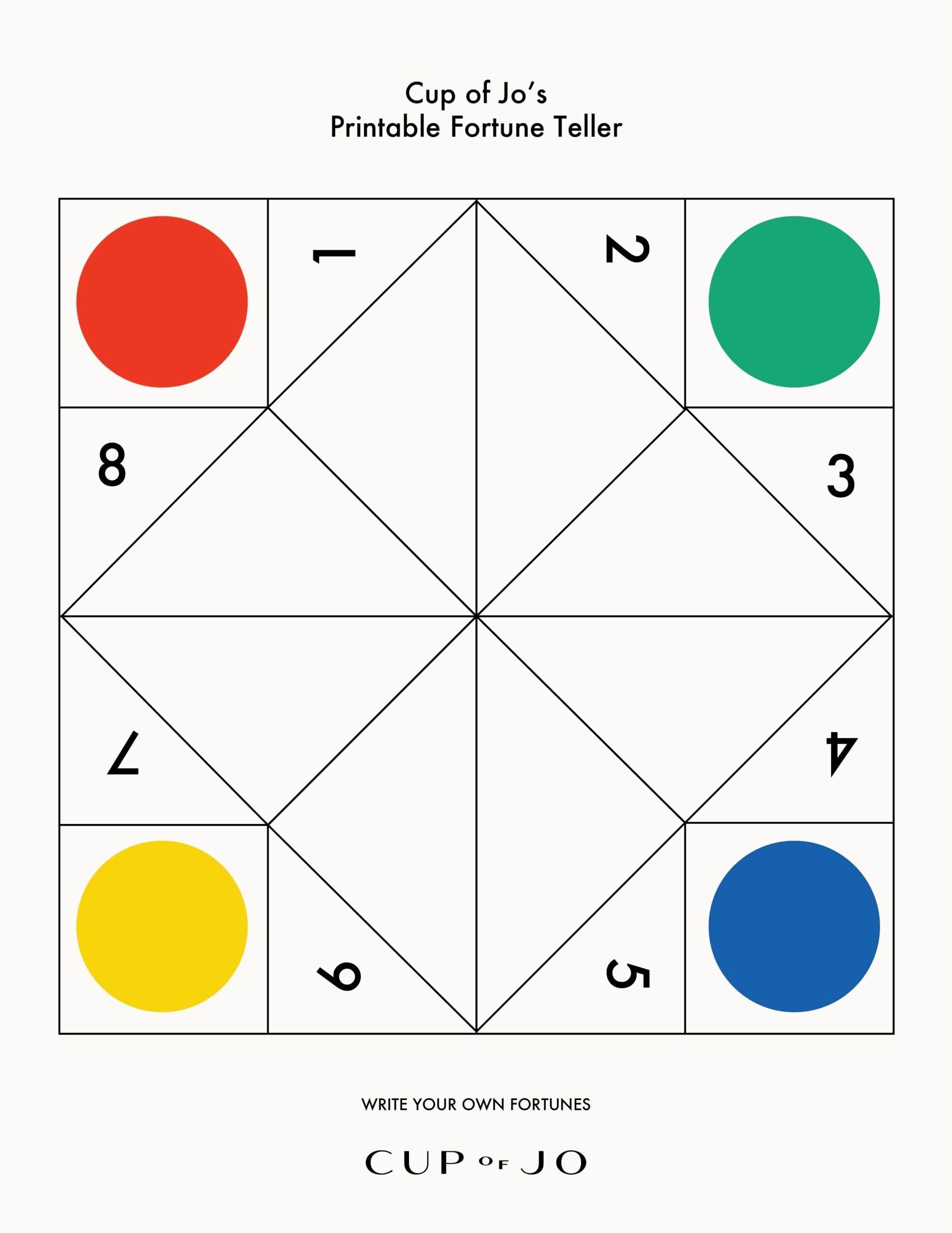 A fortune teller paper printable is a small piece of paper that is folded into a shape that can be manipulated with your fingers. Each section of the paper is labeled with a different color or number, and hidden beneath these flaps are predictions or fortunes. The person using the fortune teller asks a question and then opens and closes the flaps a certain number of times to reveal their answer.