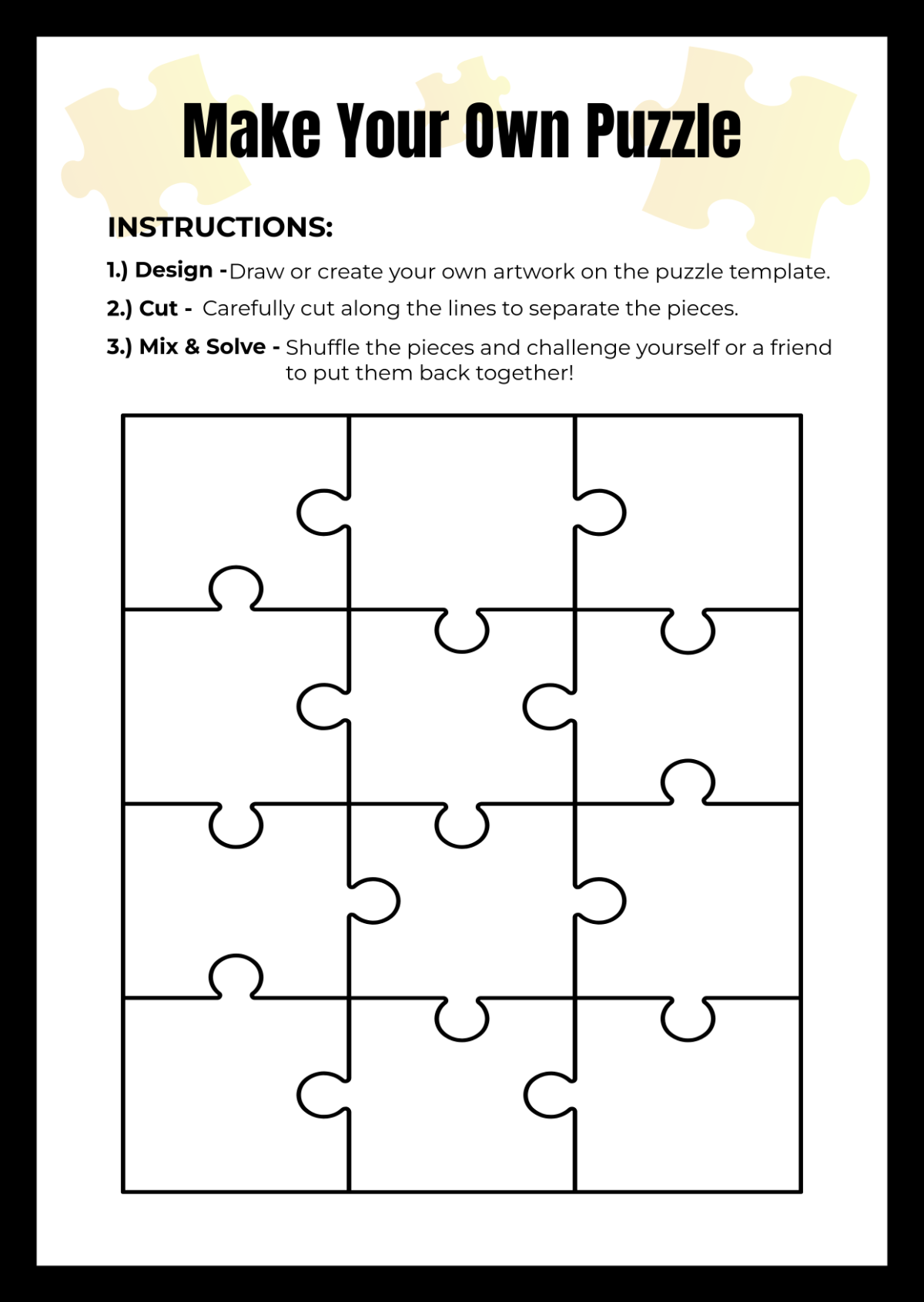 In conclusion, creating your own puzzle template can be a fun and creative process. By following these steps and using your imagination, you can design a custom puzzle template that is unique to you. So go ahead and start making your own puzzles today!