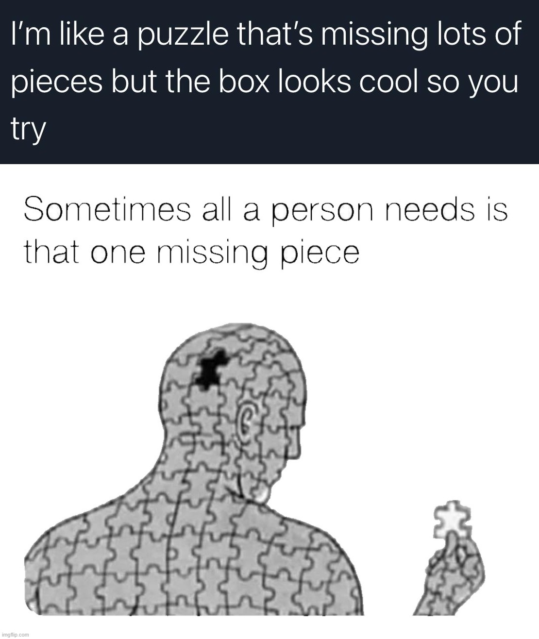 Internet memes have become a popular form of online communication, often used to express humor, sarcasm, or relatable situations. One particular meme template that has gained traction is the missing puzzle piece meme. This template features an image of a completed puzzle with one missing piece, symbolizing something that is incomplete or missing.