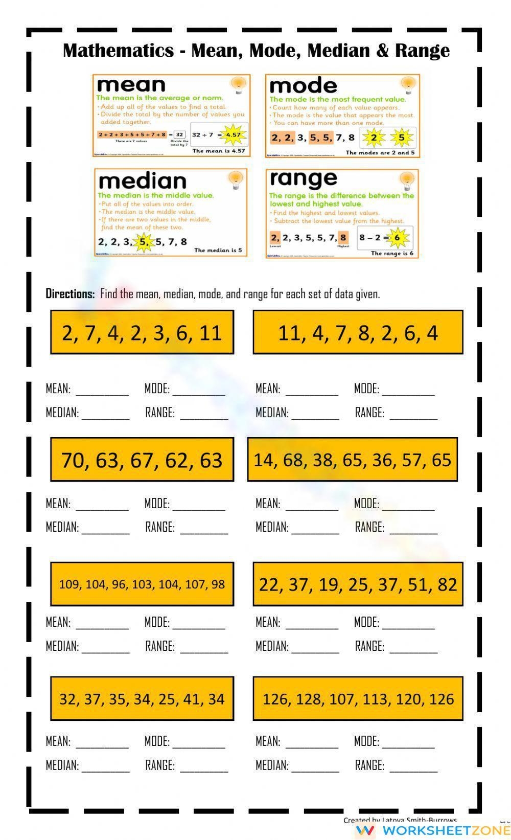 Worksheets focusing on mode, median, and range are a great way for students to practice and reinforce their understanding of these concepts. These worksheets typically include a variety of questions that require students to calculate the mode, median, and range of different sets of data. By working through these worksheets, students can improve their problem-solving skills and build confidence in their ability to analyze data.