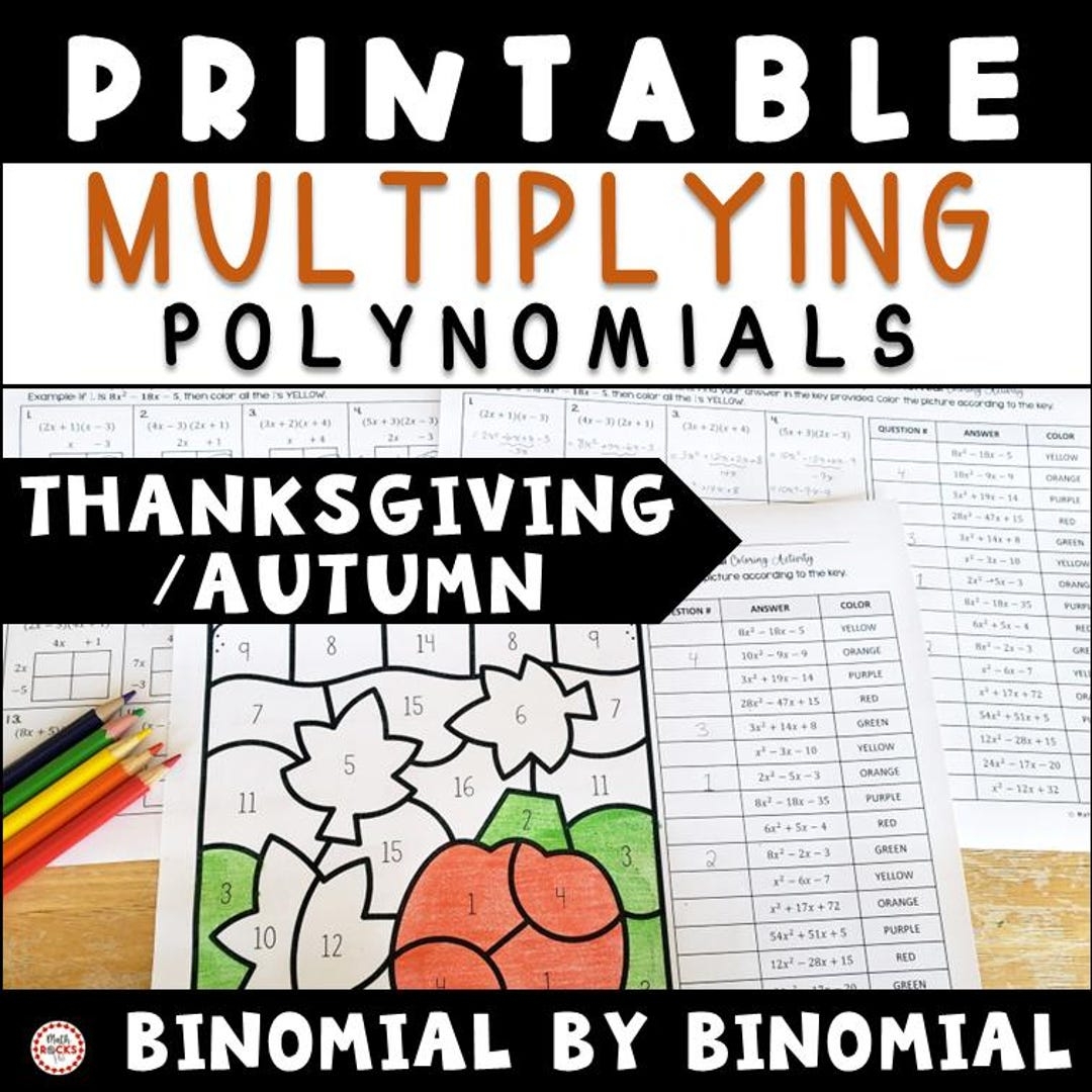 One example of a multiplying polynomials coloring worksheet answer might involve multiplying two binomials. Students would first multiply the terms in each binomial using the distributive property, then combine like terms to simplify the expression. Once they have the final answer, they can use the color key provided on the worksheet to color in the corresponding section, revealing a picture or pattern.