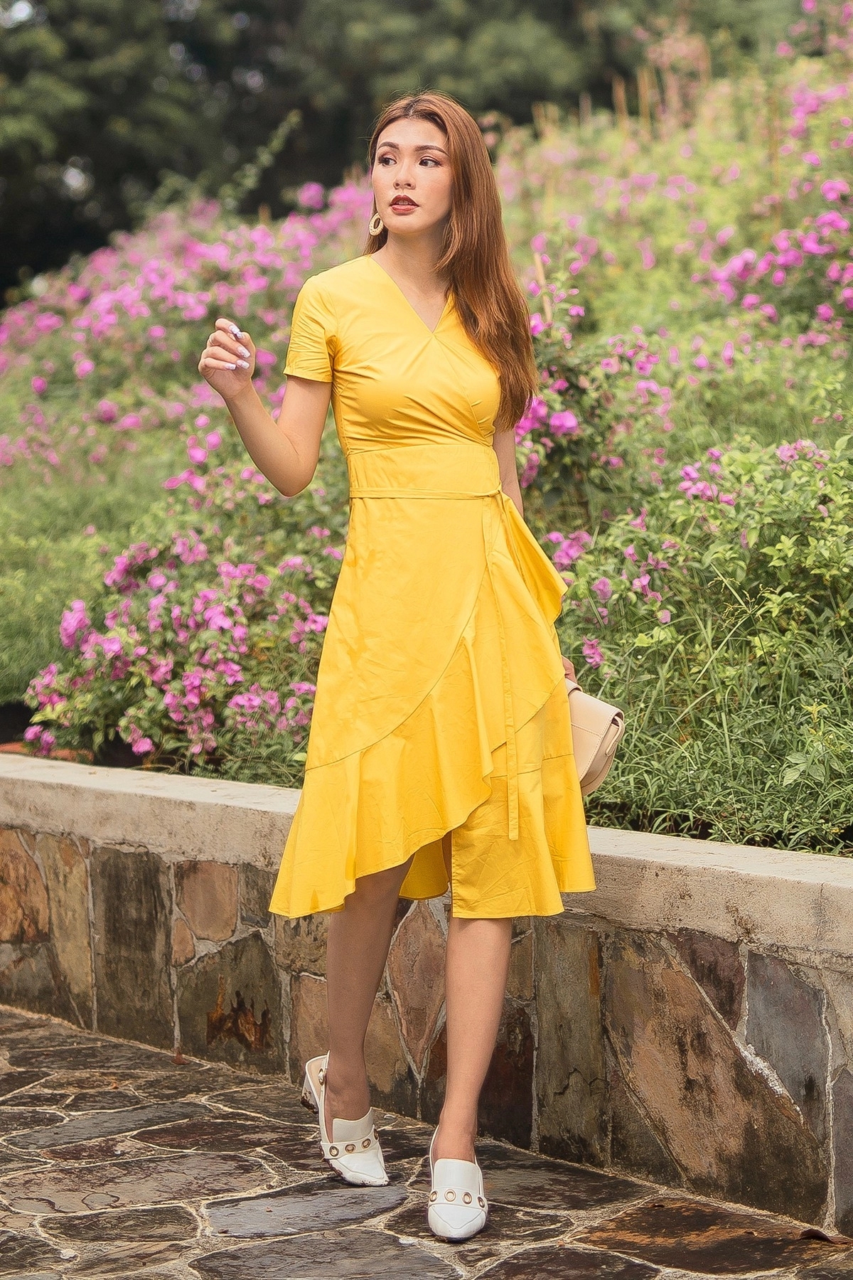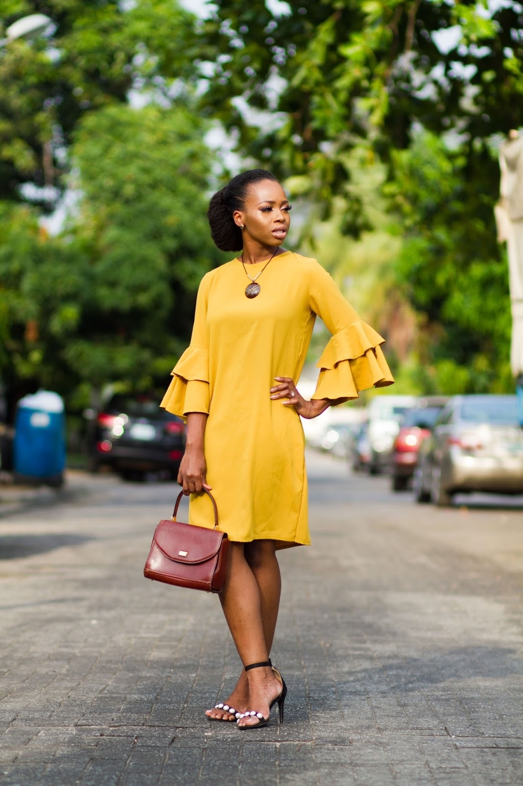When styling a mustard colored dress, it is important to keep the accessories minimal to let the color shine. Simple jewelry, a neutral clutch, and nude heels can complement the dress without overwhelming it.