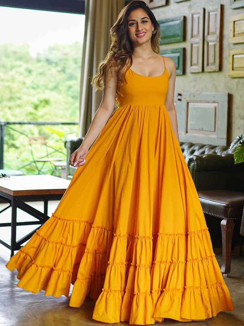 Bunaai Mustard Yellow Tiered Fit U0026 Flared Pure Cotton Maxi Length Ethnic Dress