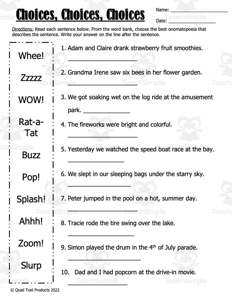 In conclusion, onomatopoeia worksheets are a valuable resource for teachers looking to enhance their students’ language arts skills. By incorporating these worksheets into their lessons, teachers can help students better understand and appreciate the use of onomatopoeia in writing. This can lead to improved vocabulary, grammar, and writing proficiency among students, making them more effective communicators in the future.