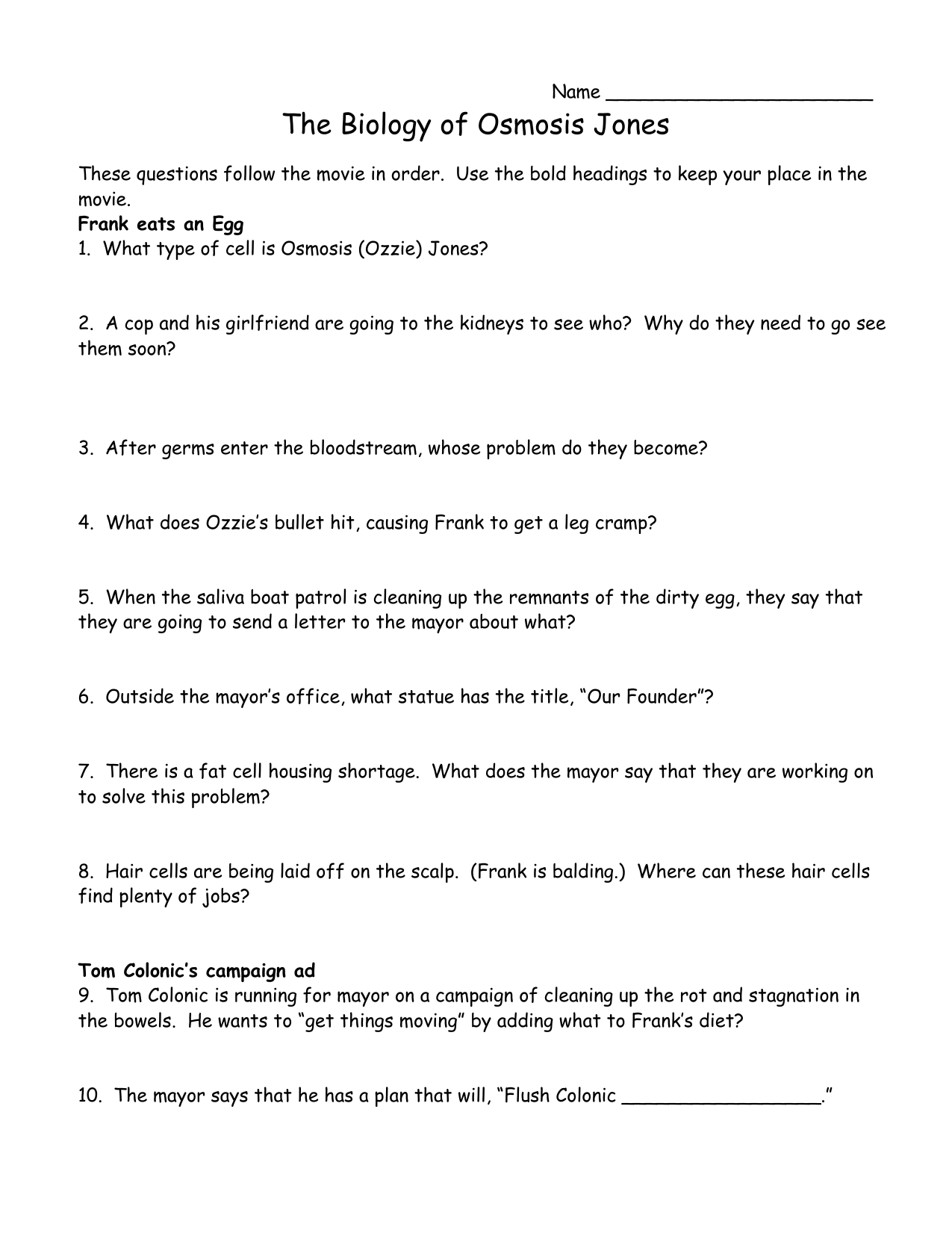Osmosis Jones worksheet is a valuable tool in the study of biology and human anatomy. It provides students with a hands-on approach to learning about the human body’s immune system and how it functions to protect us from harmful pathogens. By engaging in activities and answering questions on the worksheet, students can deepen their understanding of the complex processes that occur within our bodies.