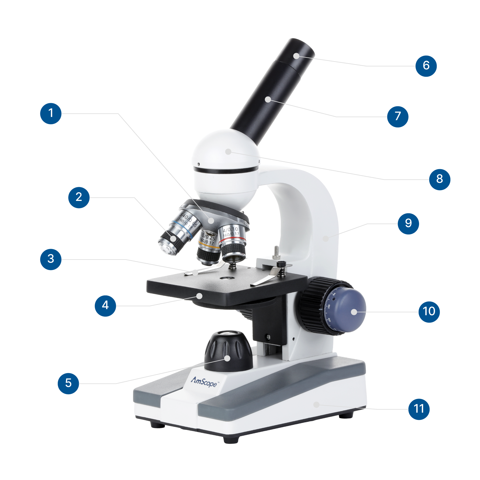 4. Illuminator: The illuminator is a light source located beneath the stage that provides illumination to the specimen. It can be adjusted to control the brightness of the light.