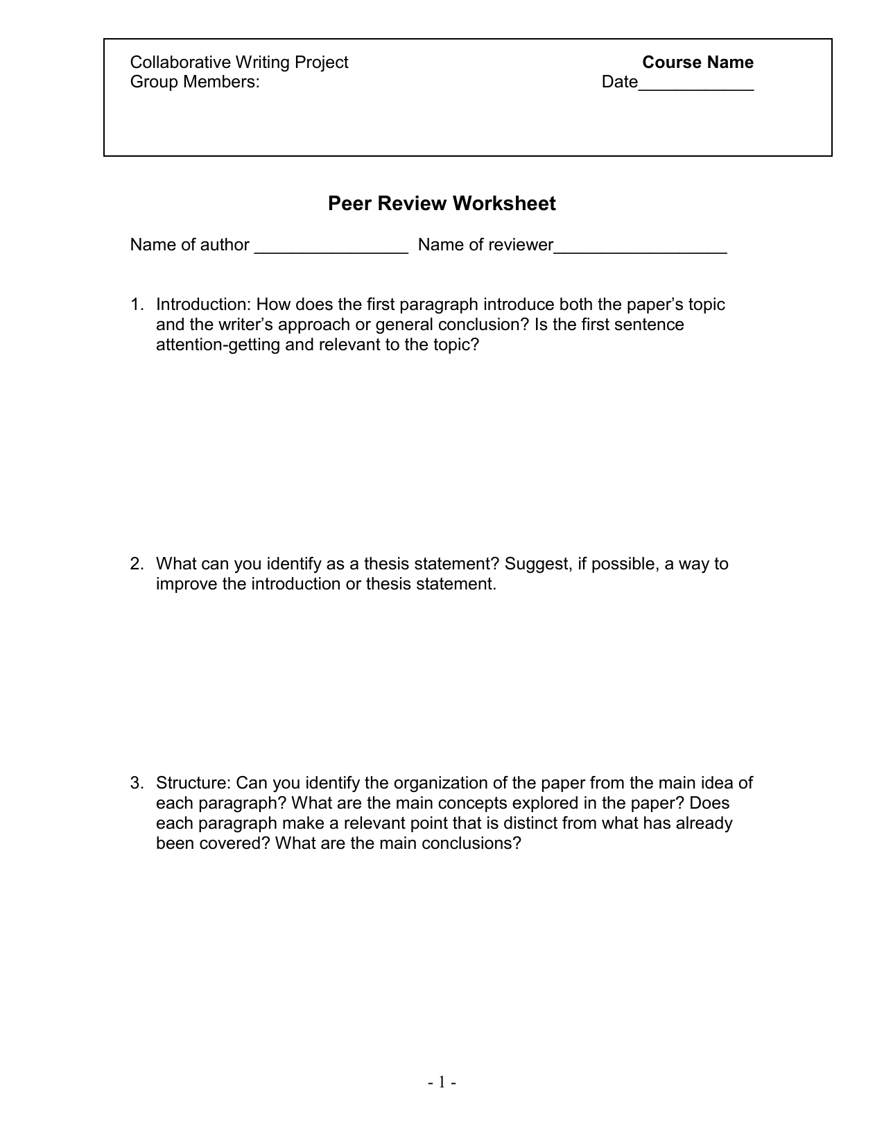 In conclusion, a peer review worksheet is a valuable tool for providing and receiving feedback on writing. By approaching the task with a constructive attitude, being thorough and honest in your feedback, and engaging in dialogue with the writer, you can help improve the quality of their work and develop your own skills as a writer and reviewer.