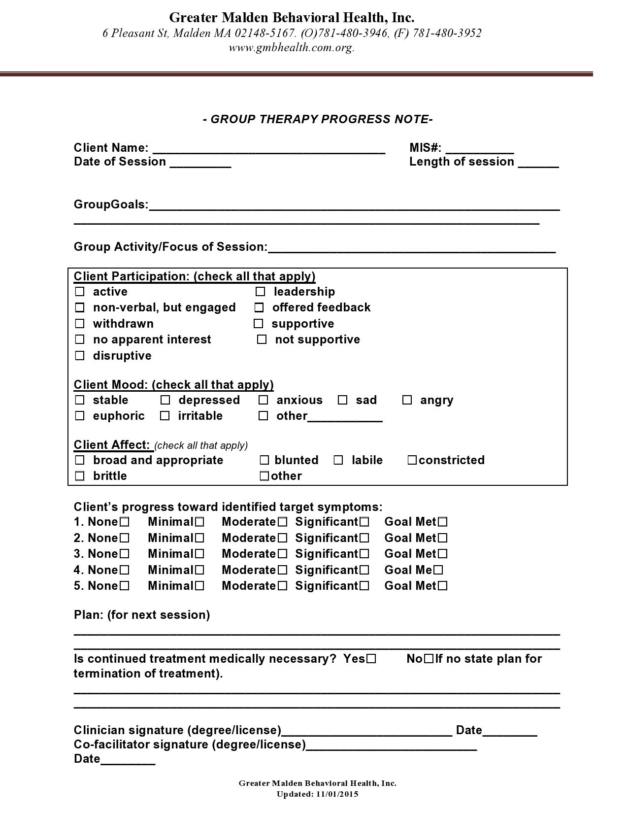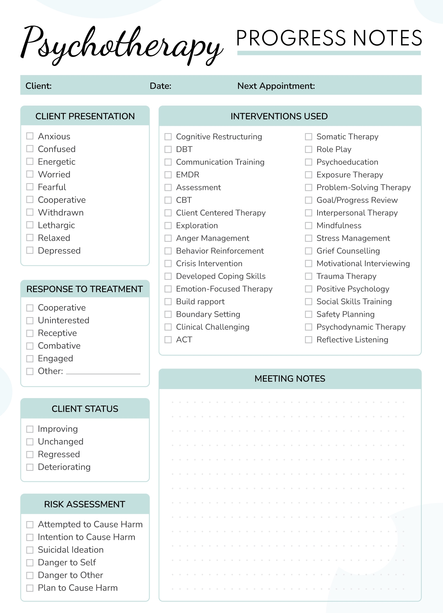 Printable Psychotherapy Progress Note Template PDF
