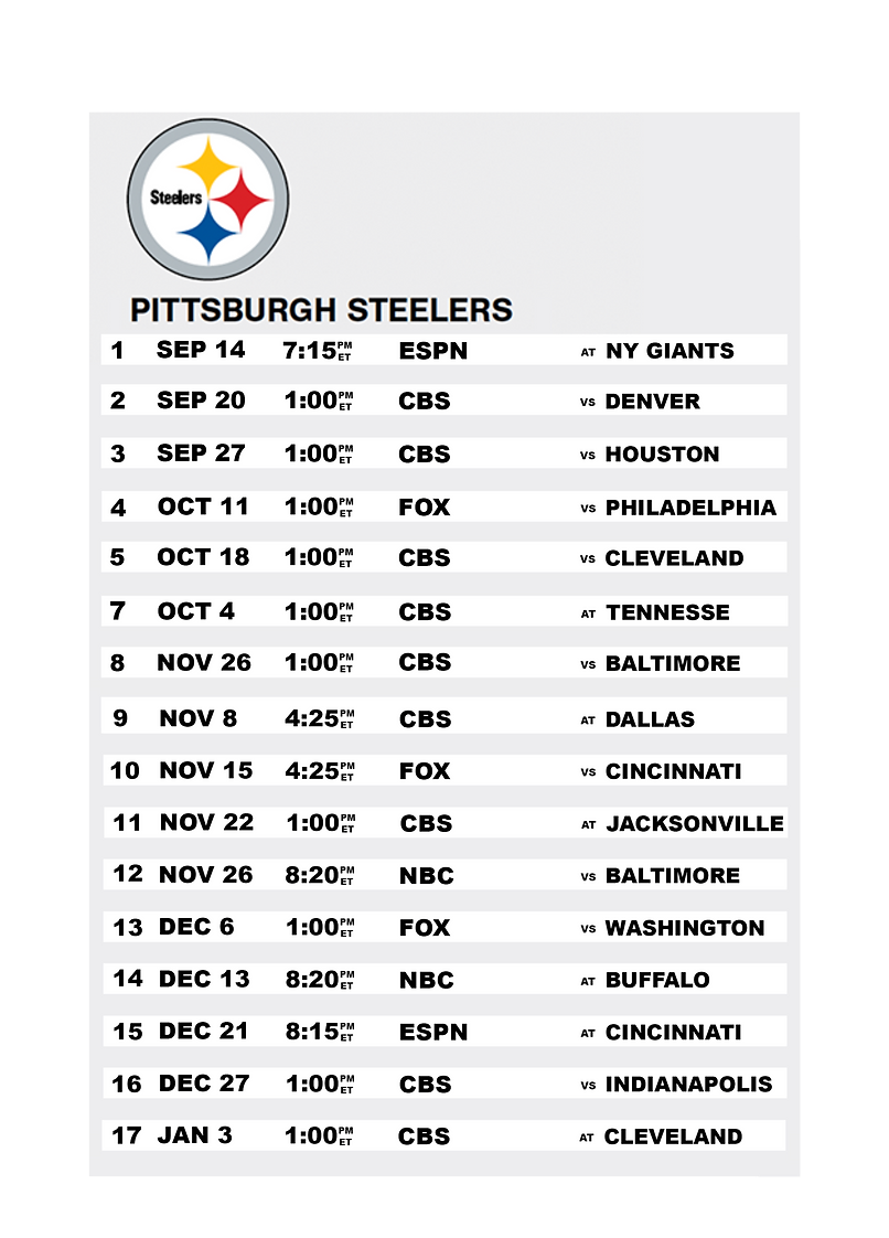 Here is the printable schedule for the Pittsburgh Steelers’ 2024 season: