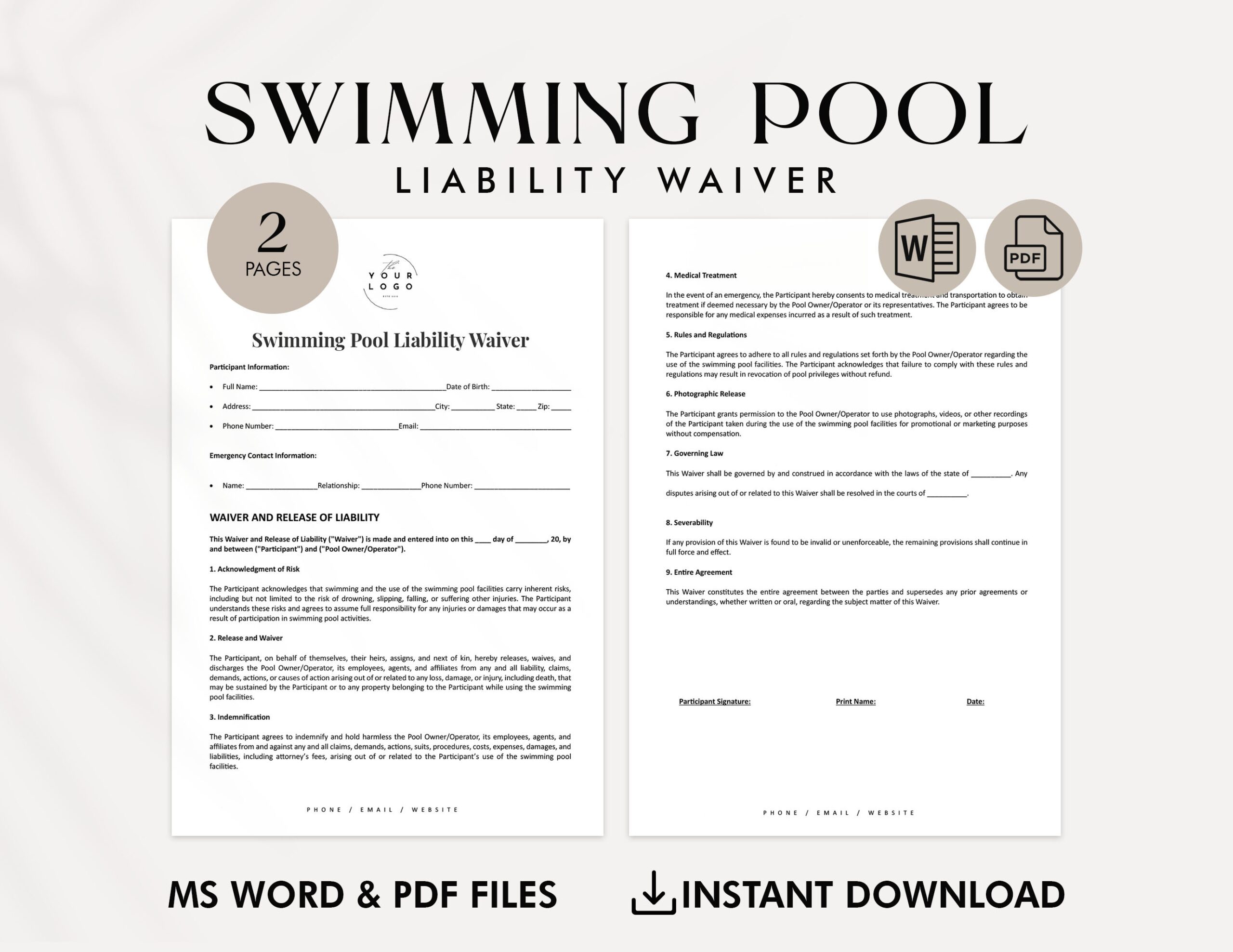 This template can be customized to include specific rules and regulations for your swimming pool facility. It is important to have swimmers sign the waiver before using the pool to ensure that they are aware of the risks involved and their responsibilities.