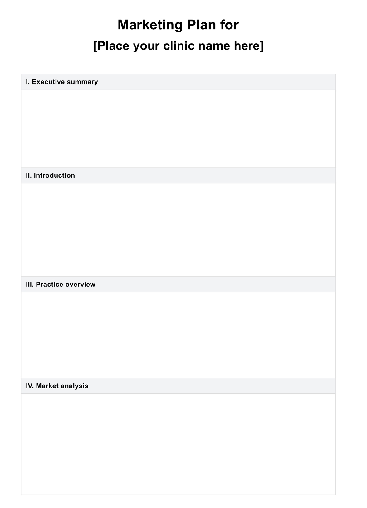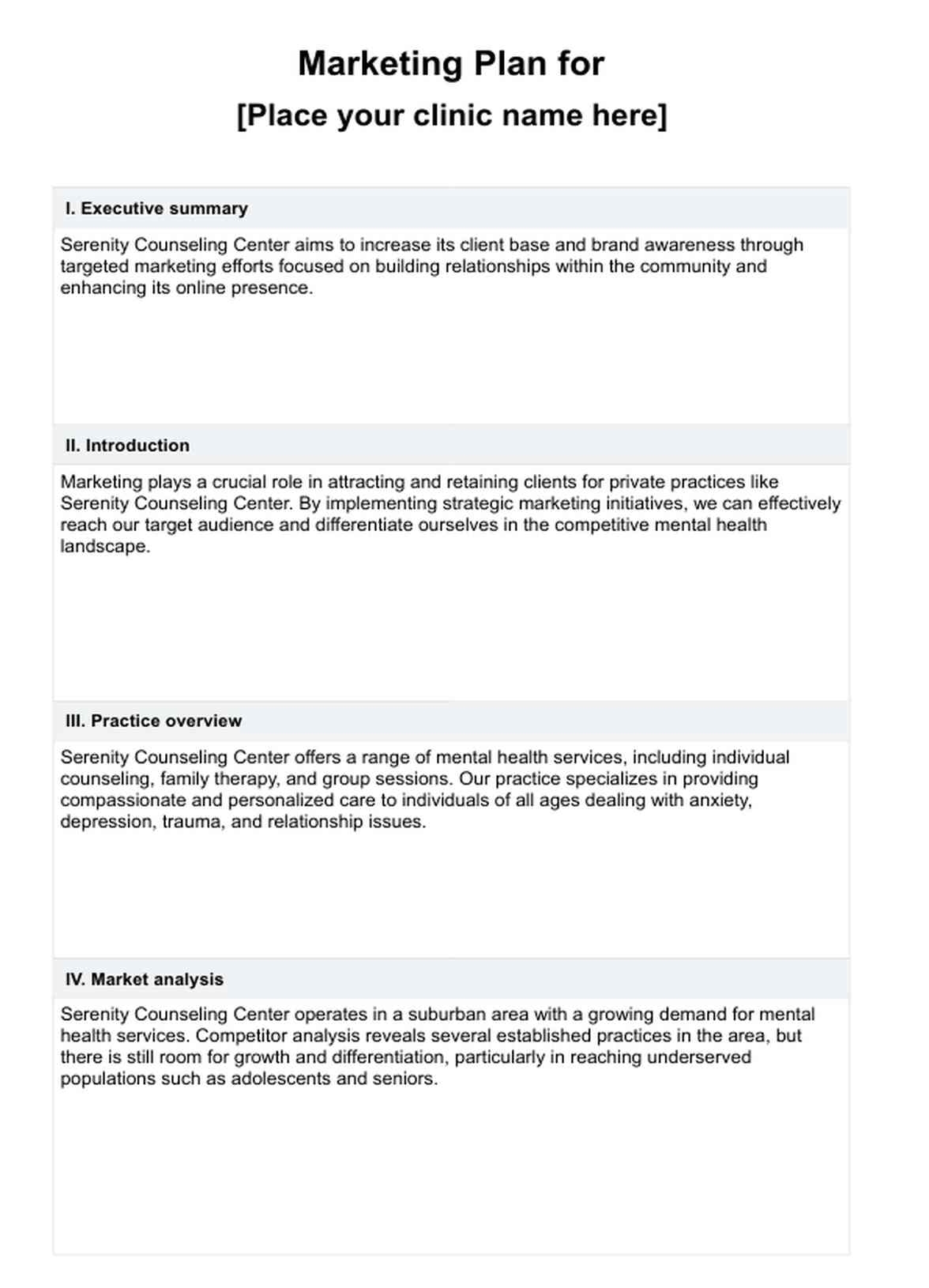 3. Marketing and Sales Strategy: This section outlines your marketing and sales efforts, including how you plan to promote your practice, attract clients, and generate revenue. It should also include details about your pricing strategy and any partnerships or collaborations you plan to pursue.