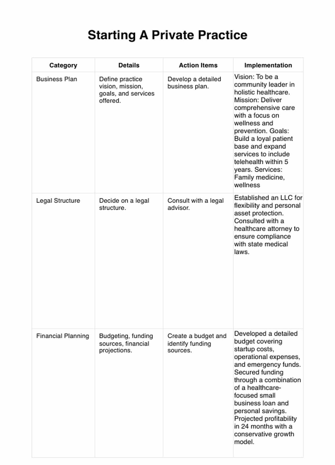 2. Business Description: Here, you will provide detailed information about your practice, including your legal structure, location, and services offered. You should also include information about your target market and how you plan to attract and retain clients.