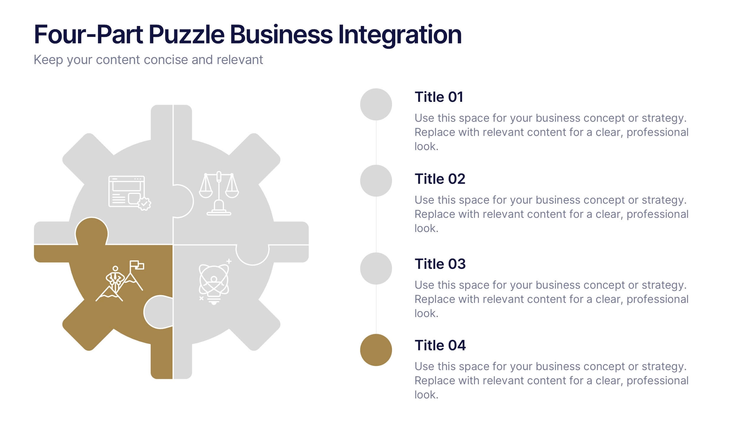 Whether you are creating a presentation, a report, or a website, using the puzzle piece in a quadrant template can help you effectively convey your message and engage your audience. It provides a structured approach to organizing information and allows for easy navigation through the different sections.