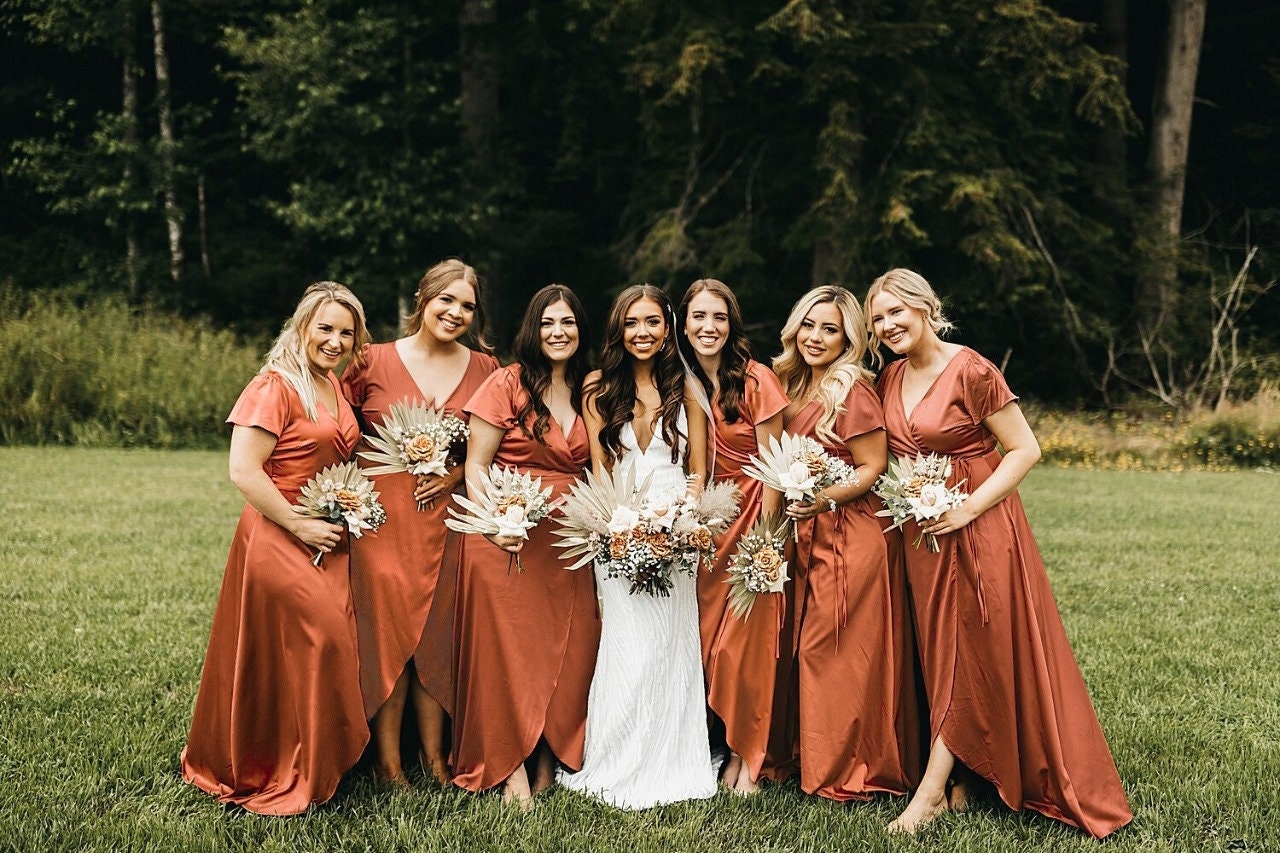 Additionally, rust is a color that looks great on a variety of fabrics and styles. Whether you prefer a flowy chiffon gown or a sleek satin dress, there are plenty of options available in this gorgeous hue. Your bridesmaids are sure to feel confident and beautiful in a rust colored dress that suits their individual tastes and body types.