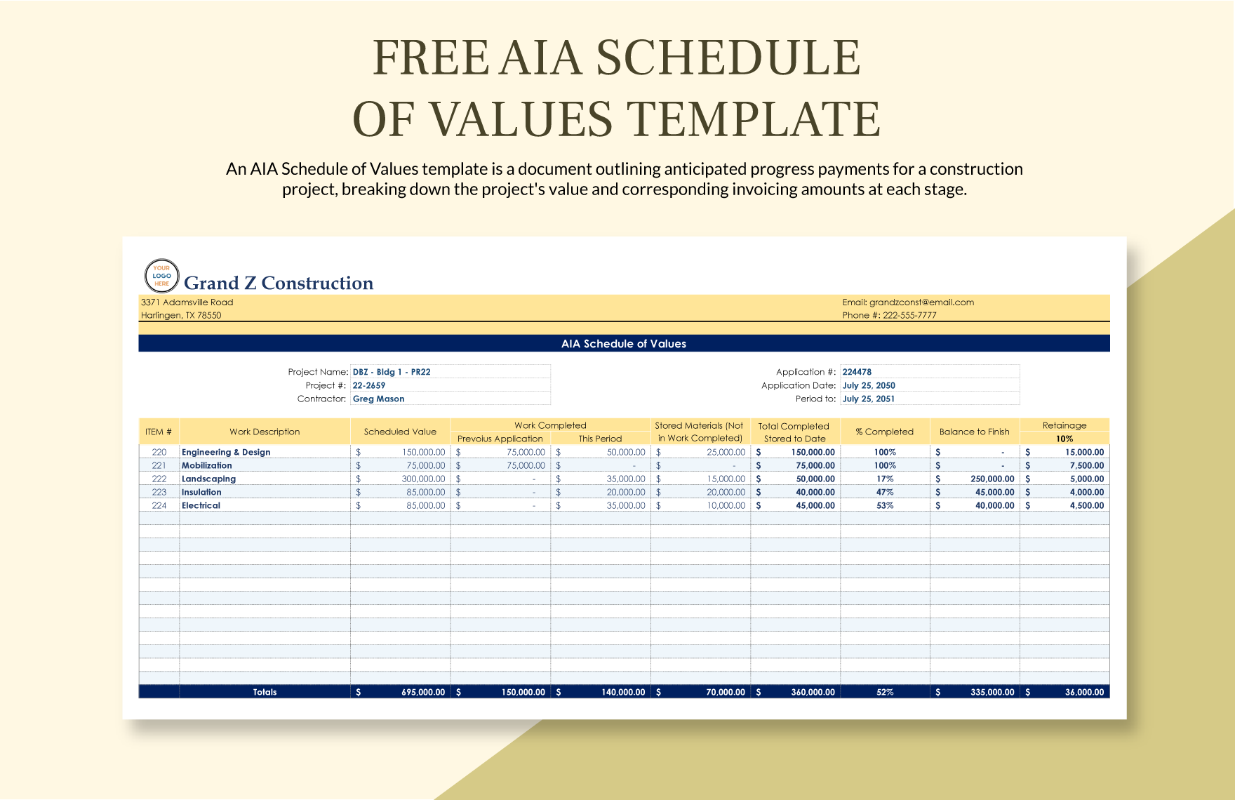 The AIA schedule of values template is a document that breaks down the total contract amount into specific line items, each representing a different aspect of the project. These line items typically include materials, labor, equipment, and other costs associated with the construction process. By assigning a value to each item, project managers can track progress and monitor expenses throughout the project.