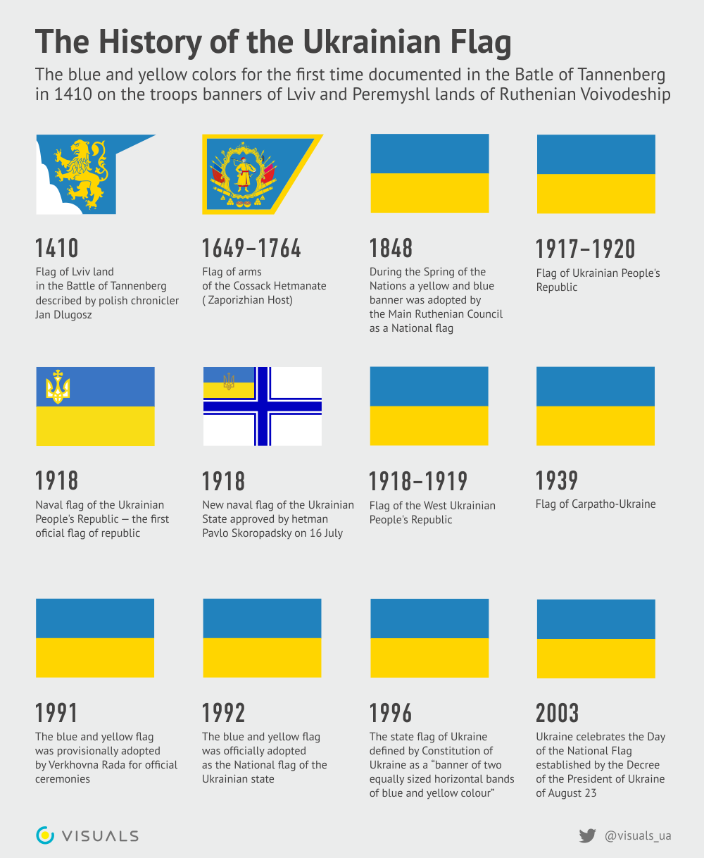 The blue and yellow colors of the Ukrainian flag have been used in various forms since the 19th century and were officially adopted as the national flag in 1918. The blue represents the clear skies and the yellow represents the country’s golden fields of wheat, symbolizing prosperity and abundance.